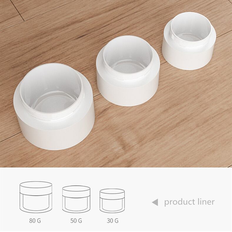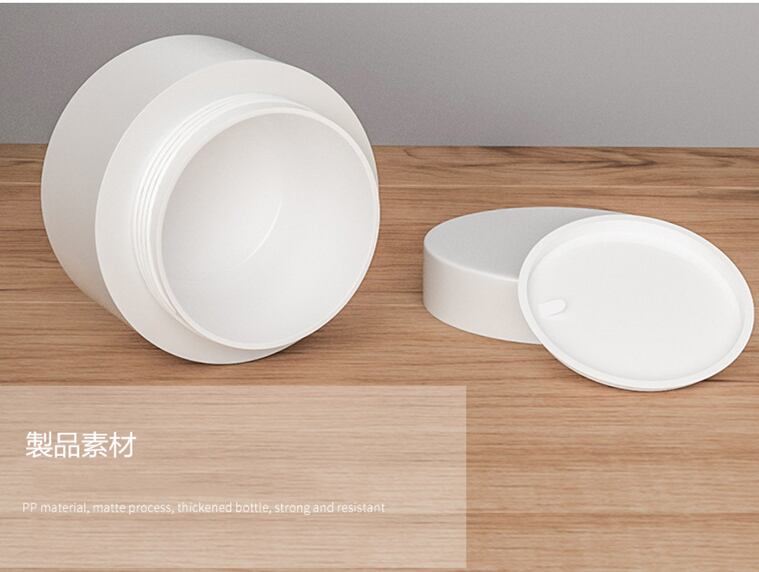 流行のストレートを強調した、汎用性の高いクリーム容器です,サイズは約3ml・5ml・10ml・15ml・30ml・50ml・80mlとご用意しておりますので、幅広い用途に合わせご利用いただけます,本体はマットホワイトとなります,ジャー容器の材質はPP素材なっており、マット容器が高級感を演出しております,小ロットは100個から対応可能です。